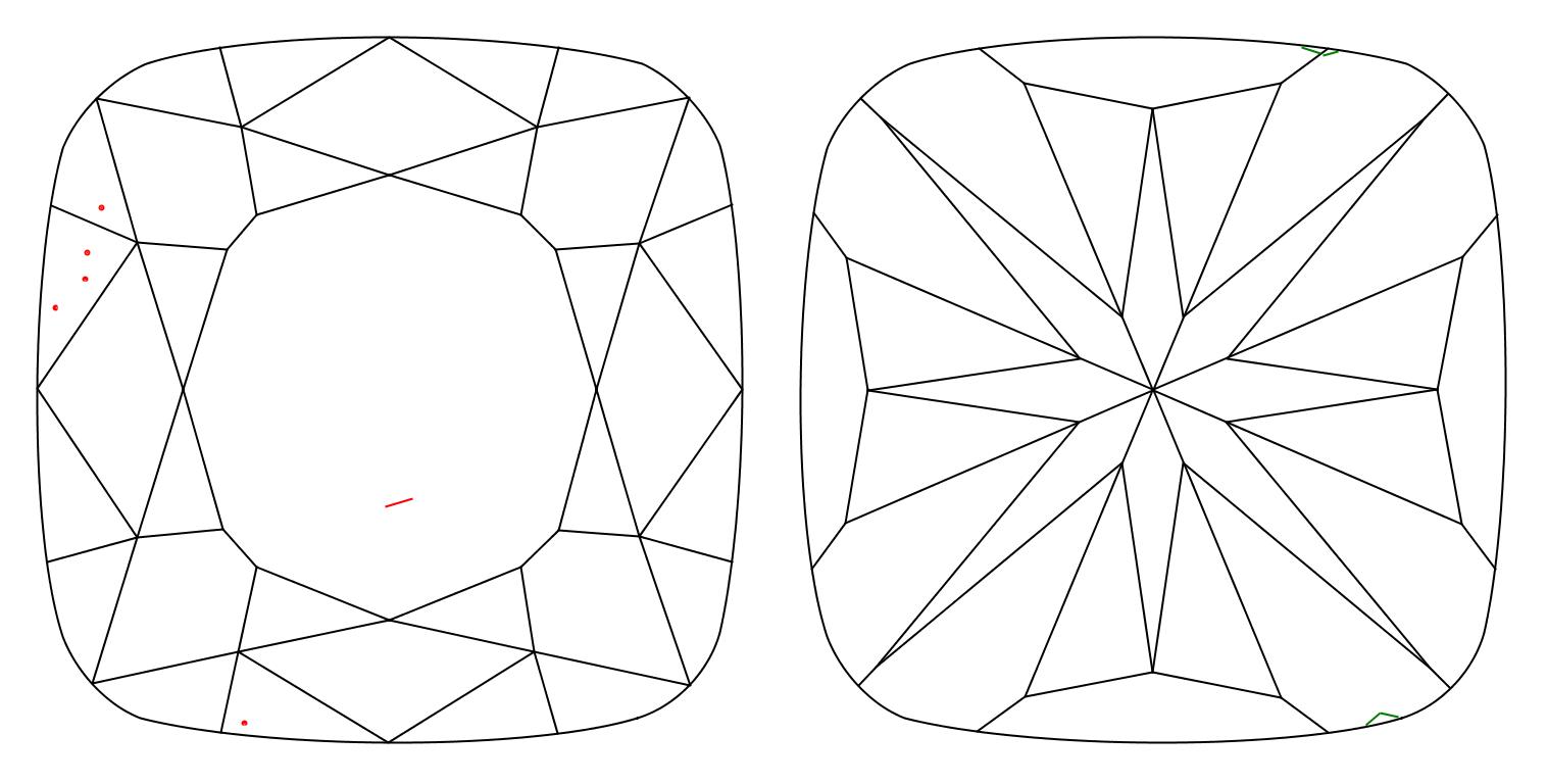 Cushion diamonds feature a combination of modern and brilliant faceting patterns. They can be square, elongated (1.2 - 1.4 L/W), or somewhere in between (1.05 - 1.15 L/W). Cushion cuts come in brilliant (star patterning), modified brilliant (crushed ice), or a hybrid of the two. Ada Diamonds checks cushions for bow ties, fish eyes, and light leakage.