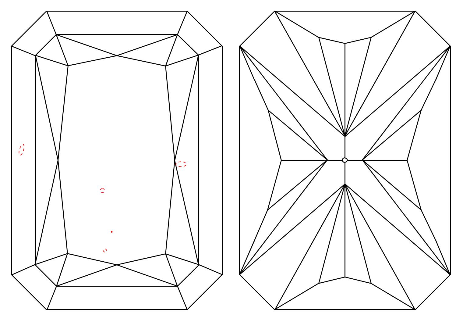 Radiant cut diamonds typically have 70 facets, compared to a round brilliant's 57, giving them extra sparkle and an icy appearance. At Ada Diamonds, we specialize in elongated radiants with length-to-width ratios of 1.35 - 1.45. We screen radiant cuts for empty paneling, bow ties, fish eyes, light leakage, and bulls-eye centers.