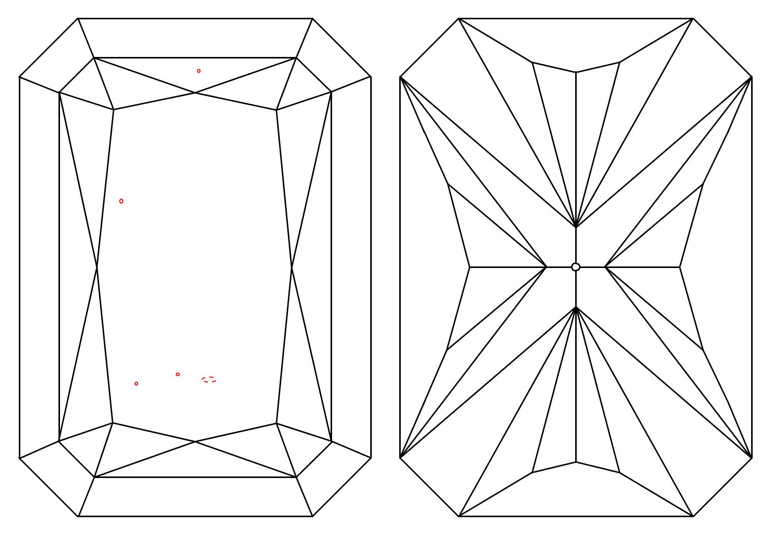 Radiant cut diamonds typically have 70 facets, compared to a round brilliant's 57, giving them extra sparkle and an icy appearance. At Ada Diamonds, we specialize in elongated radiants with length-to-width ratios of 1.35 - 1.45. We screen radiant cuts for empty paneling, bow ties, fish eyes, light leakage, and bulls-eye centers.