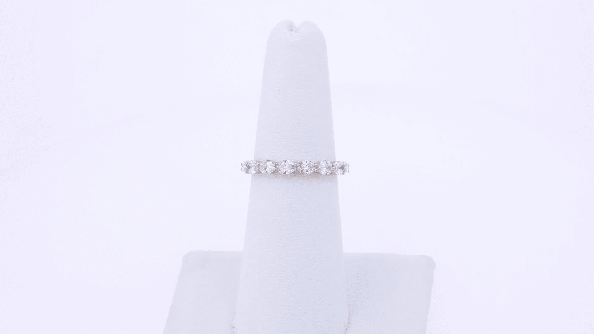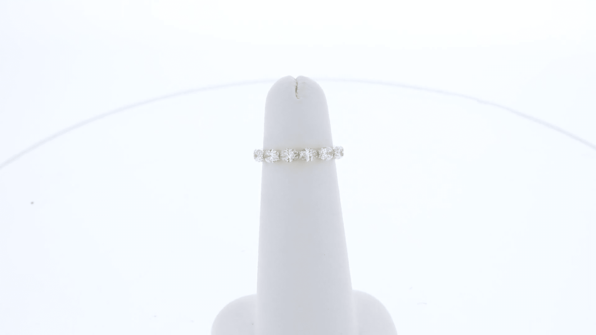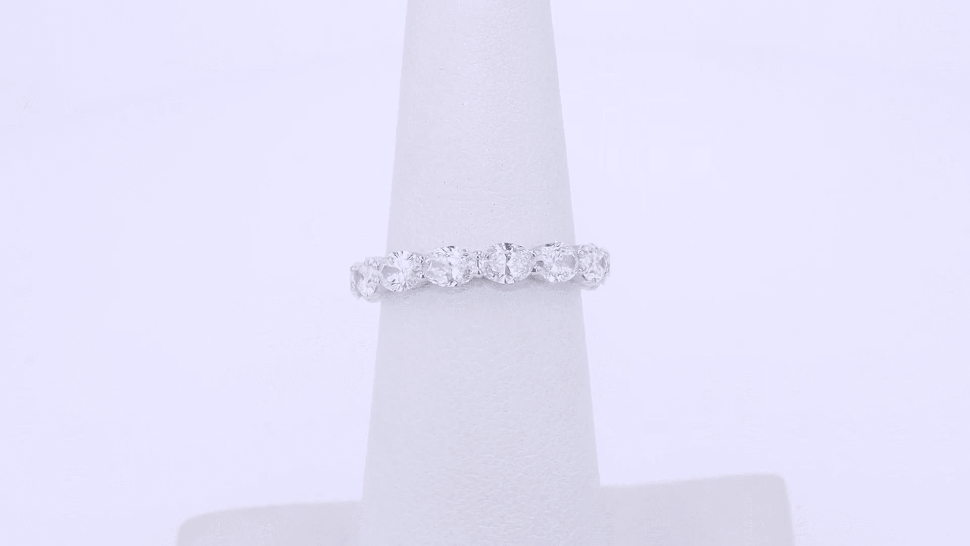 This spectacular and unique wedding band features an east-west circle of oval cut lab grown diamonds set in a shared prong style. This ring cannot be re-sized.