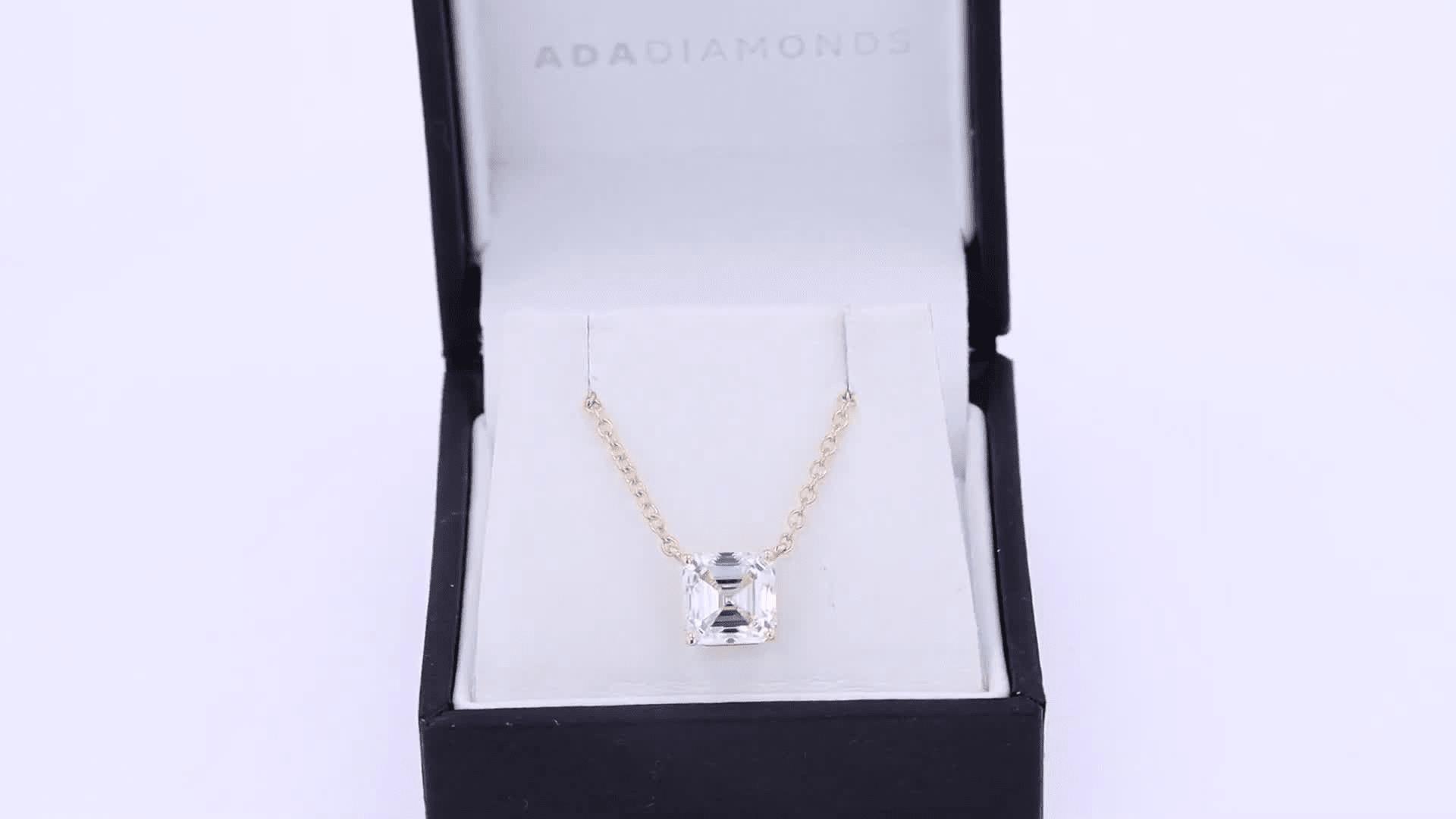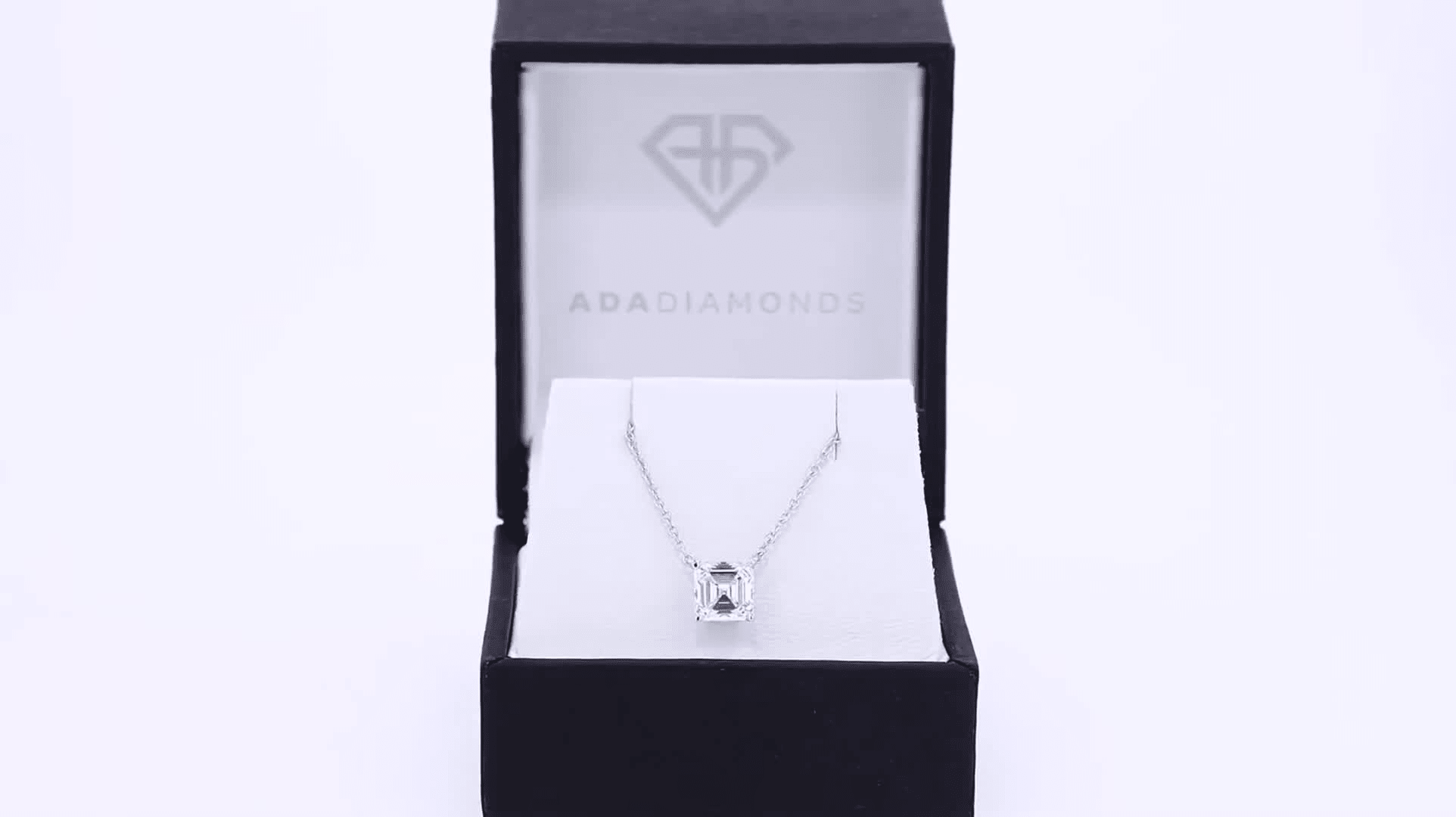 A solitaire necklace featuring a lab grown asscher cut diamond.