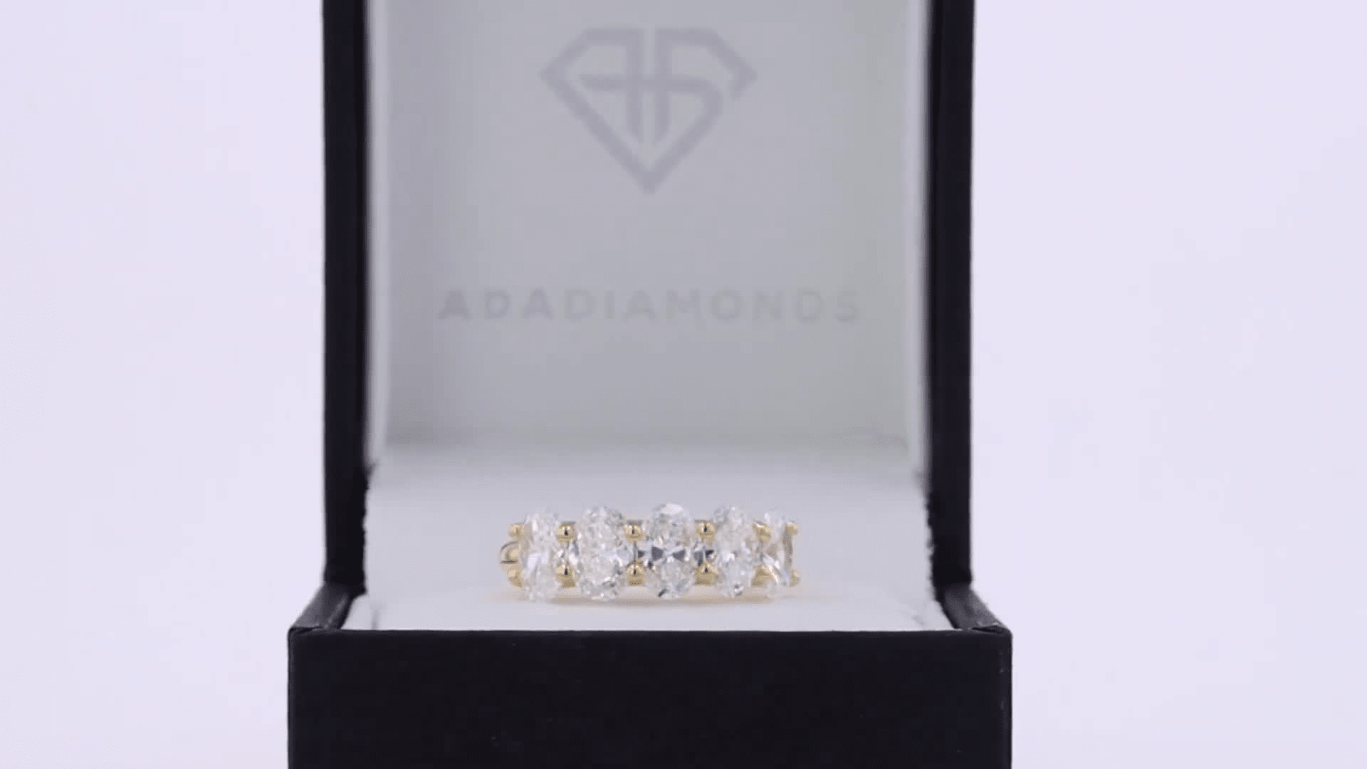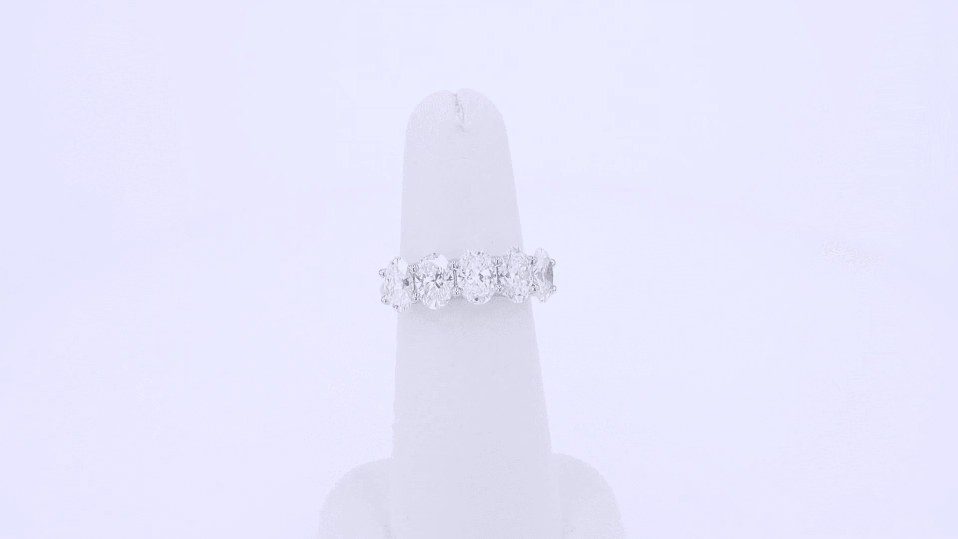 This stunning wedding or anniversary band features five oval cut lab grown diamonds basket set in the band. This ring can easily be re-sized.