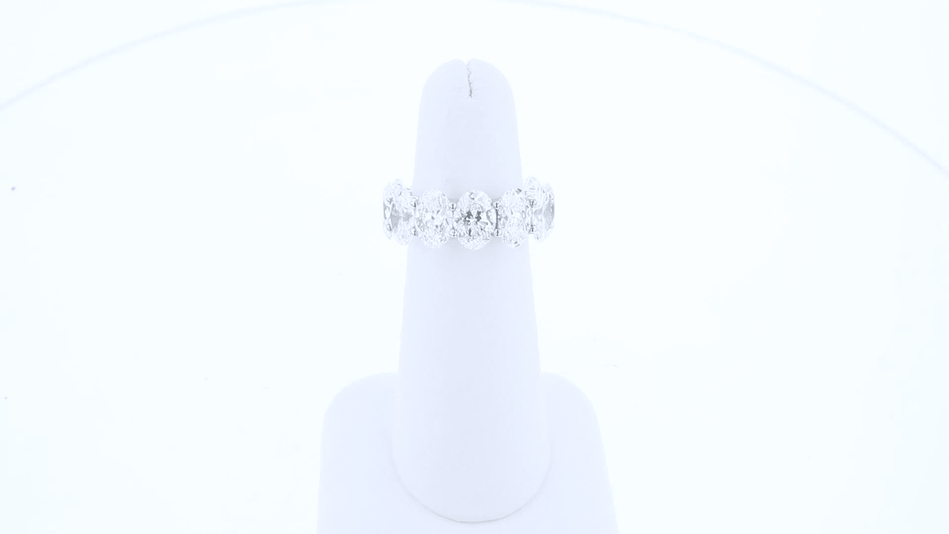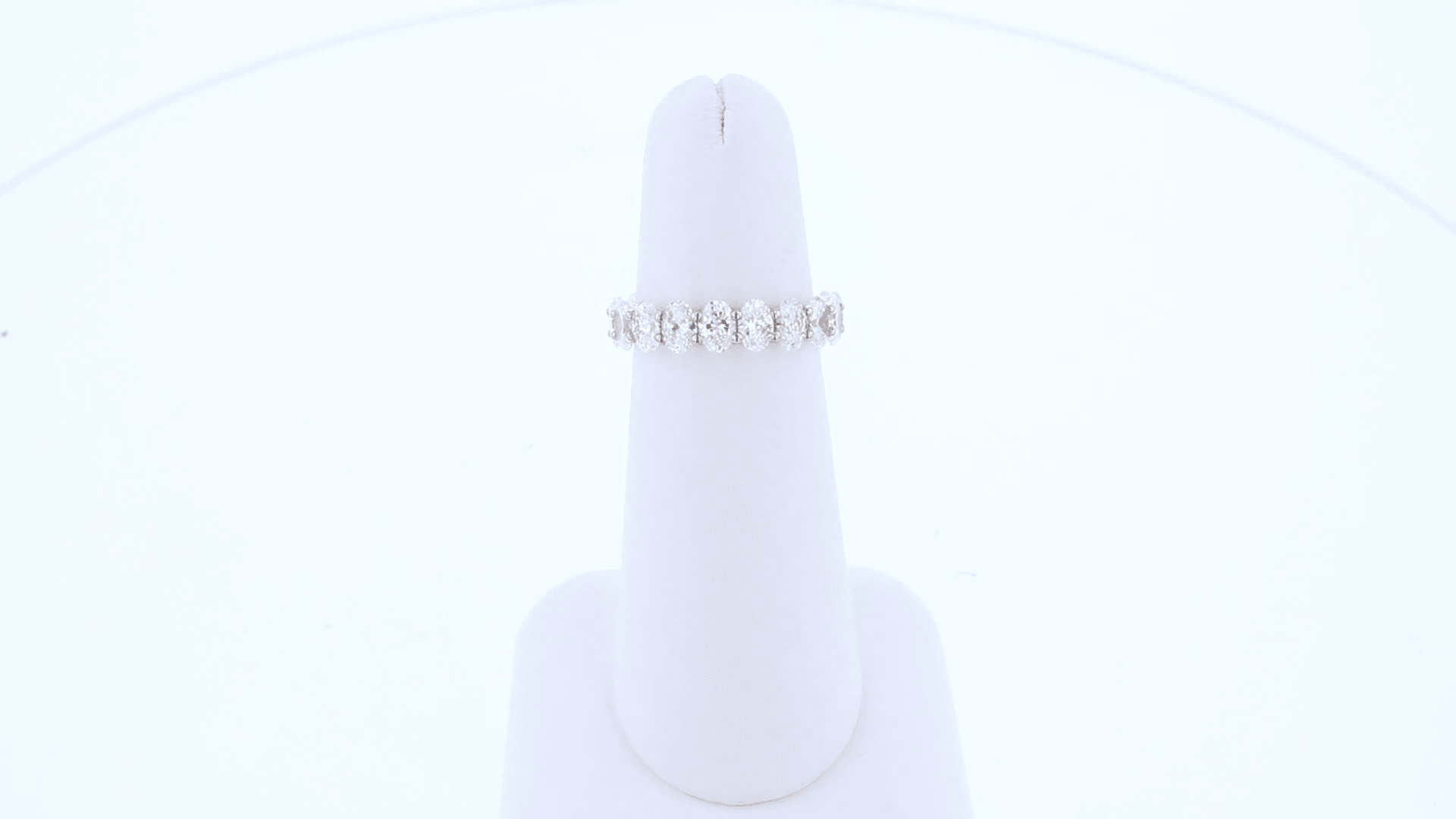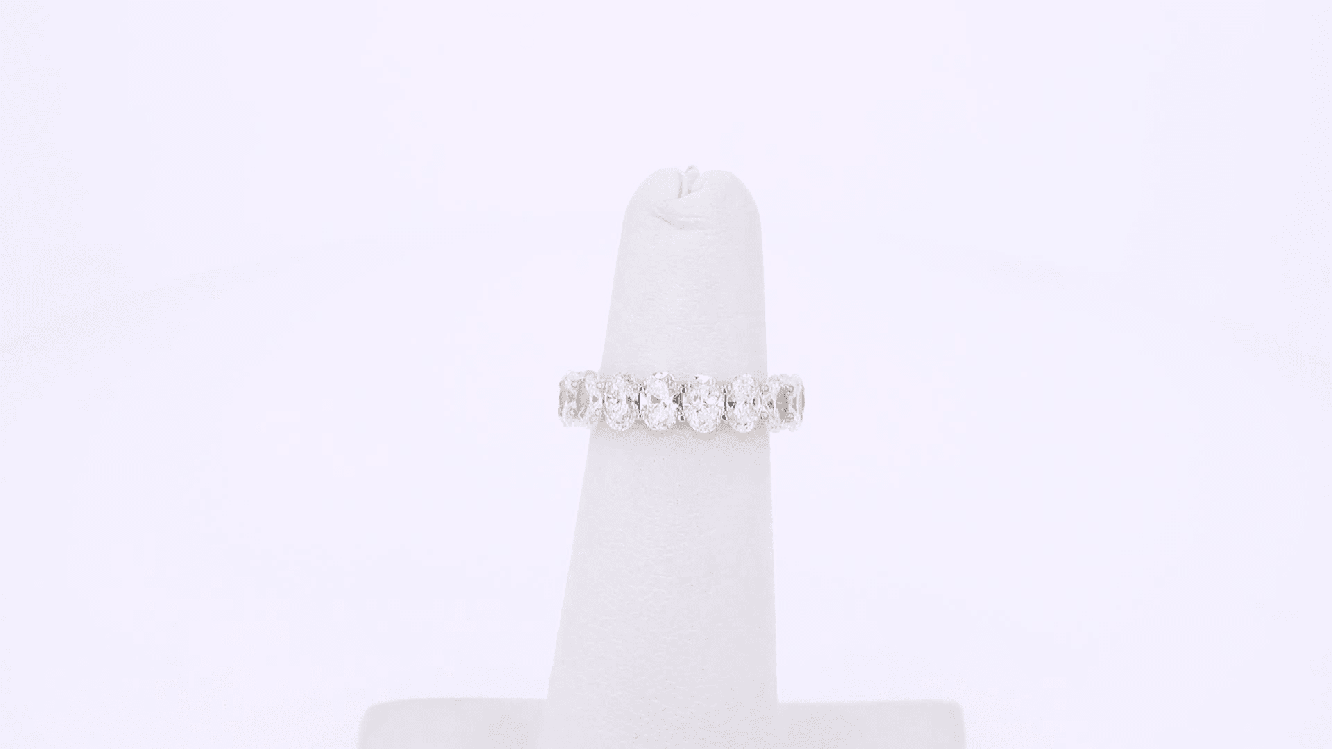 This incredible conflict-free wedding band features a sparkling circle of oval cut lab grown diamonds set in a French u style. This ring cannot be re-sized.