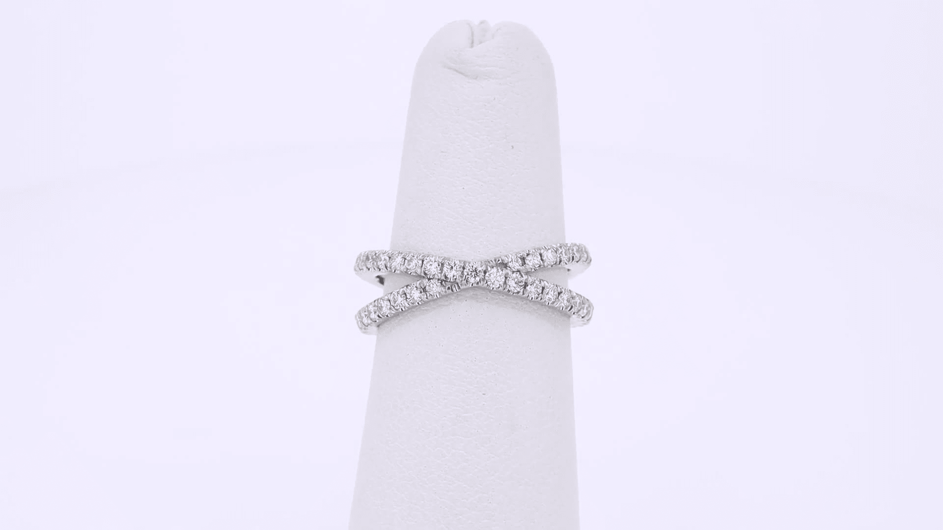 This unique band features two crossing rows of u-pave set conflict-free lab grown diamonds. This ring can be re-sized.