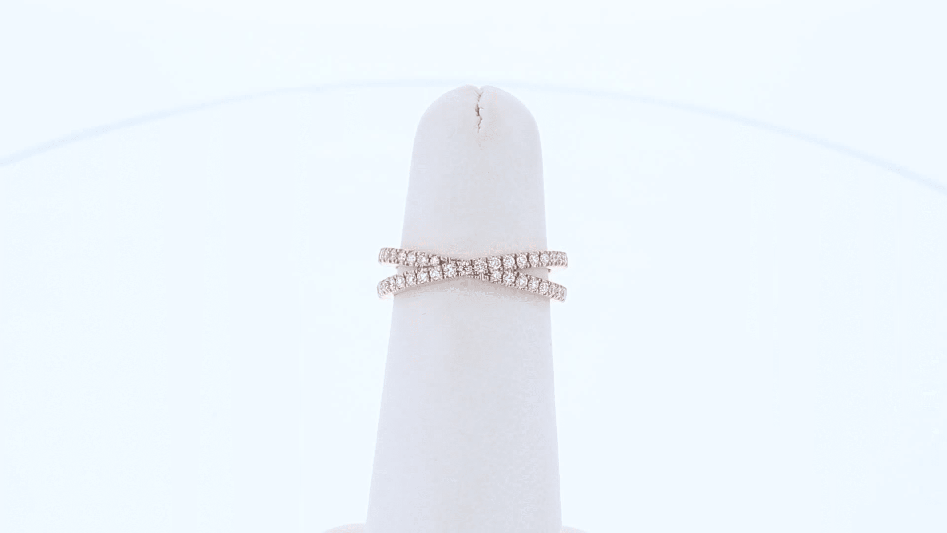 This unique band features two crossing rows of u-pave set conflict-free lab grown diamonds. This ring can be re-sized.