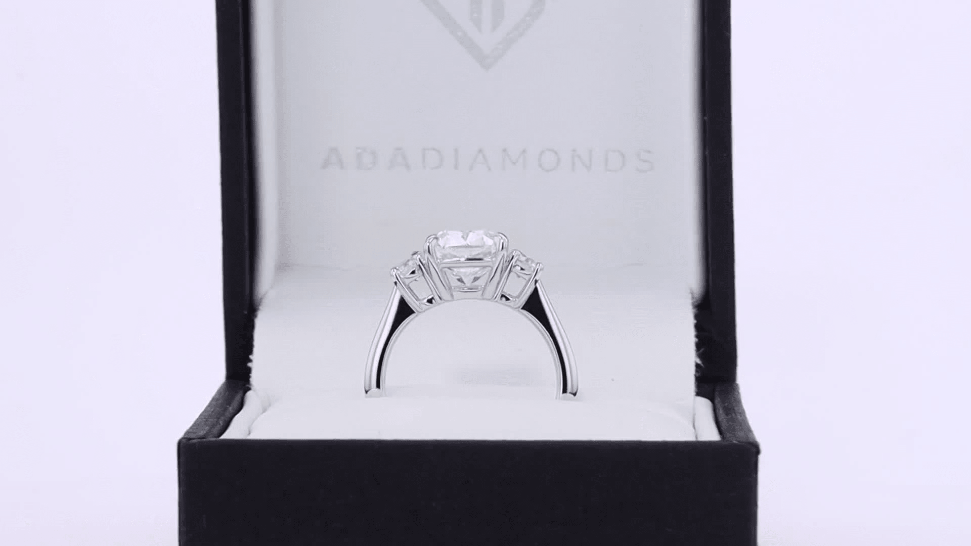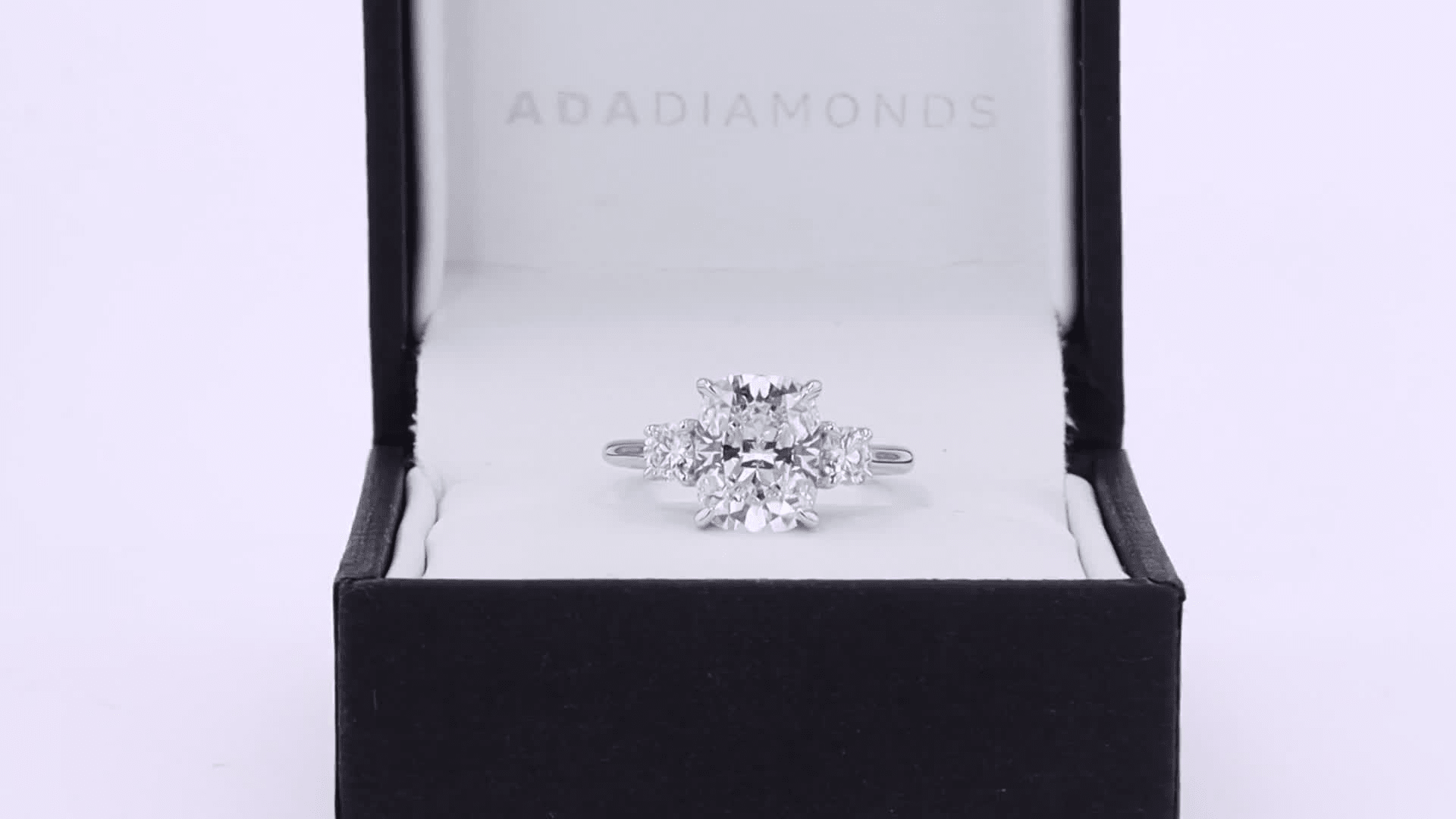 custom three stone ring with lab grown cushion and round side stone diamonds