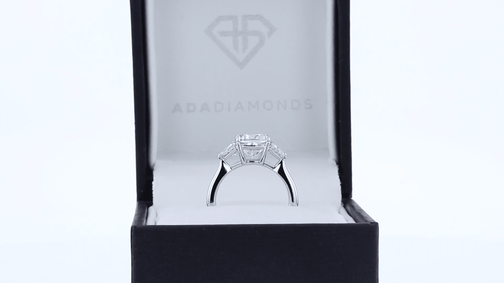 platinum 2 carat three stone lab diamond engagement ring featuring cushion cut and trillion side stones ada diamonds design ad 472