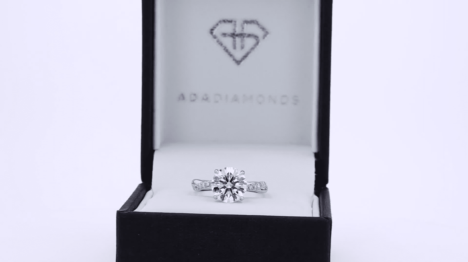 platinum two carat round laboratory grown diamond engagement ring with twisting diamond band ada diamonds design ad 154