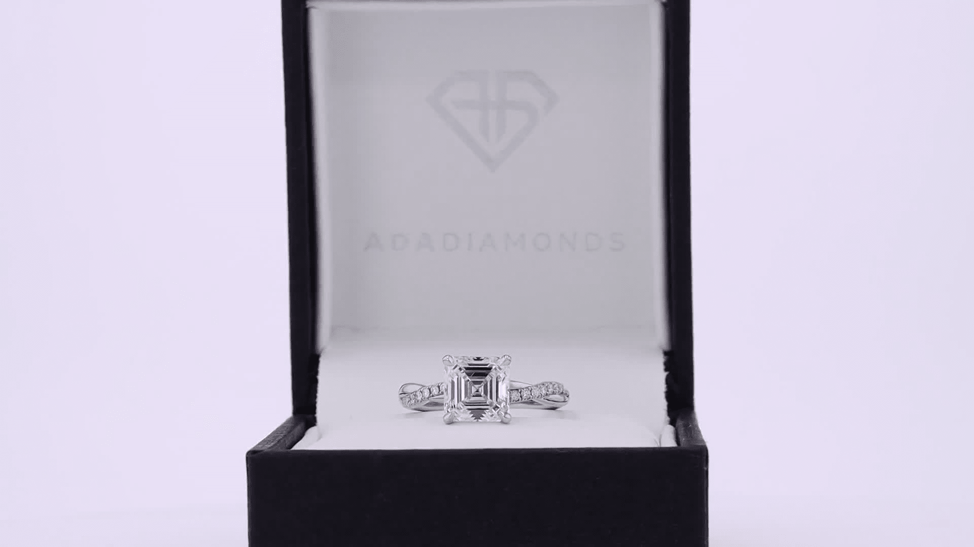 platinum 2 carat asscher cut lab diamond engagement ring with twisting diamond band ada diamonds design ad 154