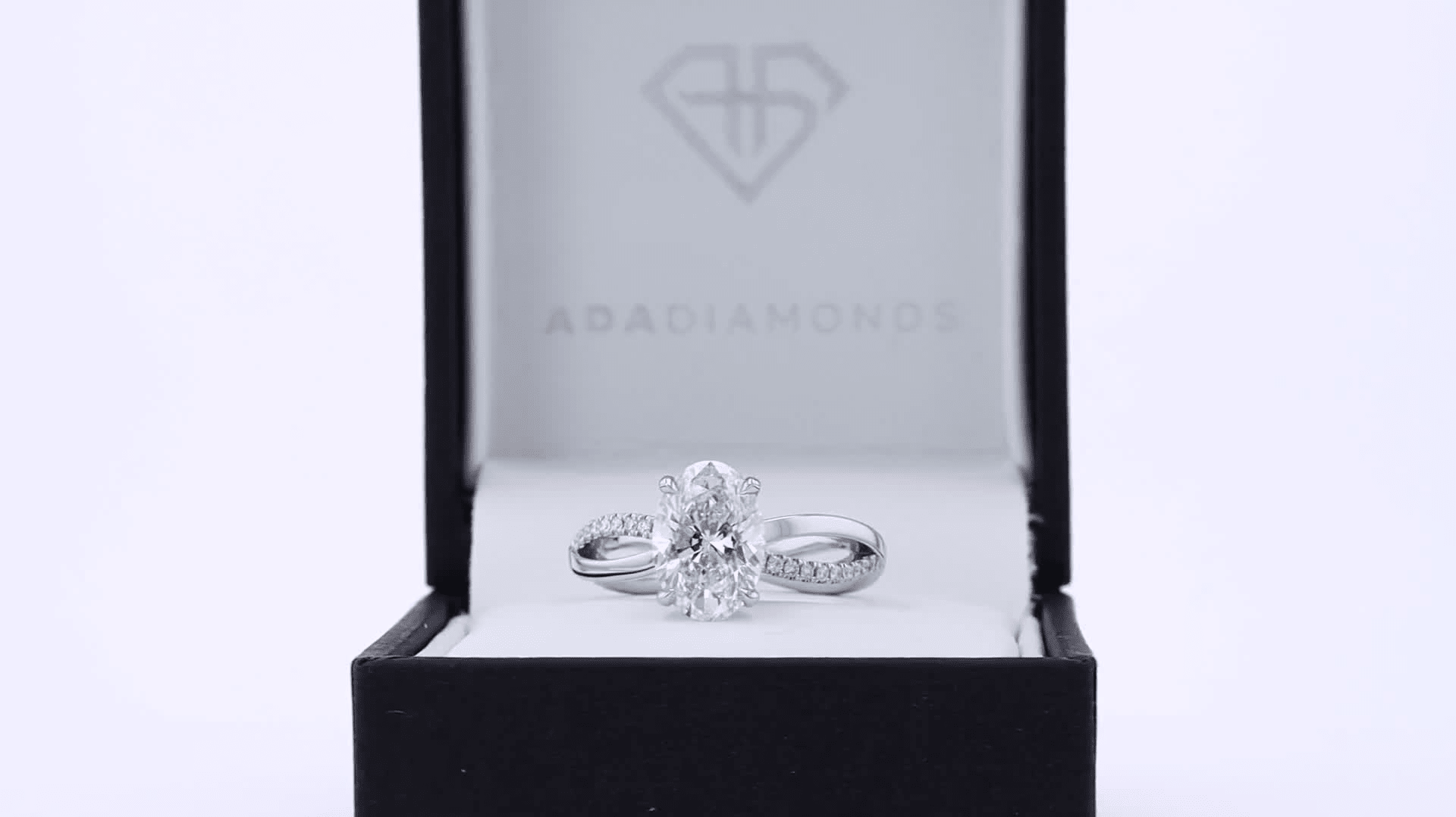 profile view of platinum 2.5ct oval lab diamond engagement ring with infinity twist diamond band ada diamonds design ad 154