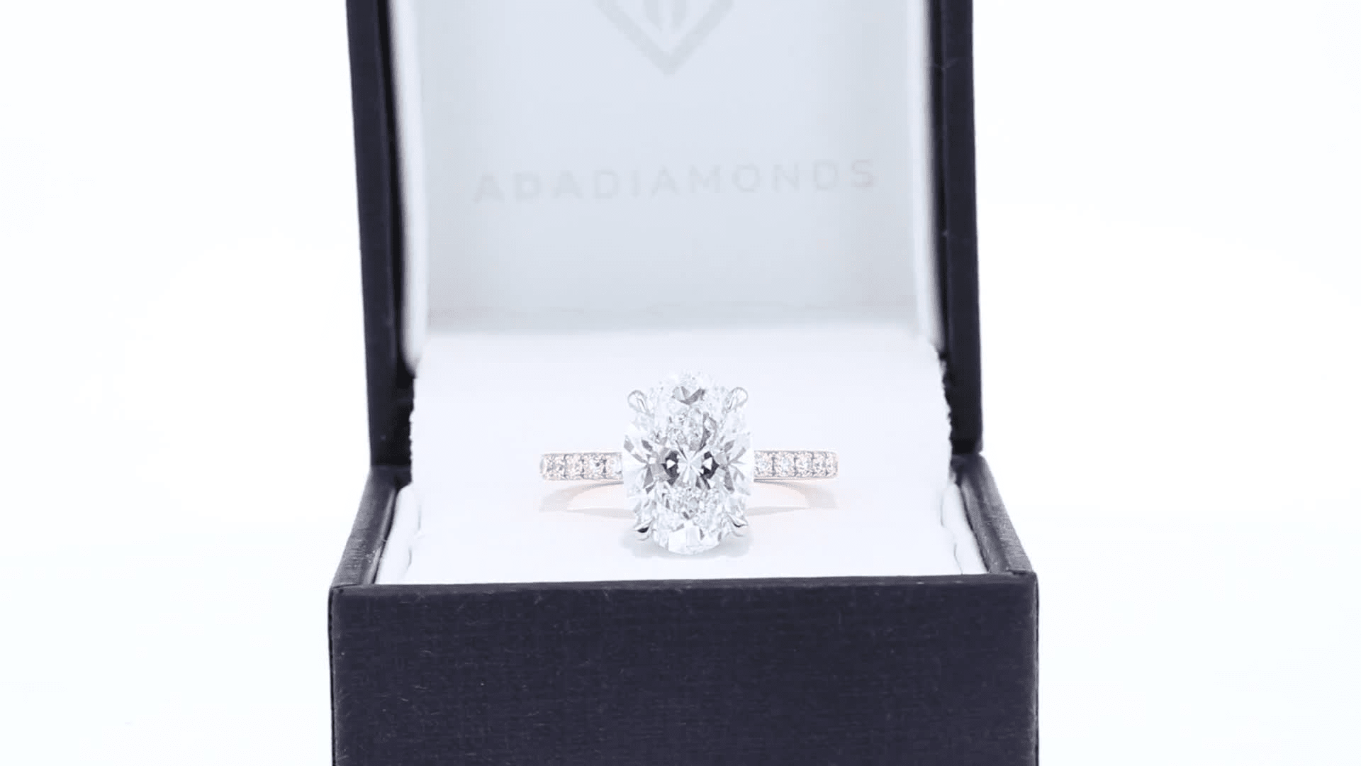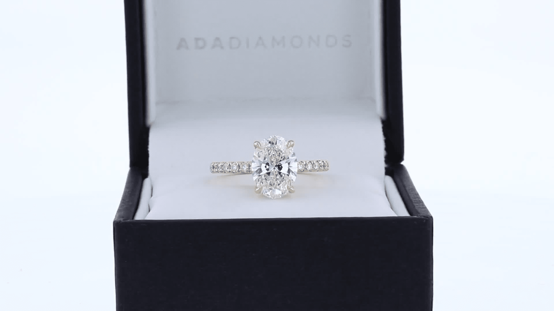 Platinum 2.5 Carat Oval Four Prong Pavé Engagement Ring with Lab Grown Diamonds Ada Diamonds Design Number 230 Profile View in Box