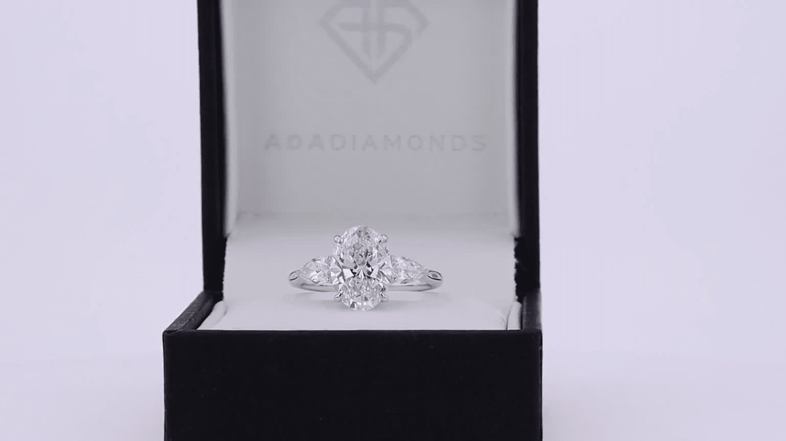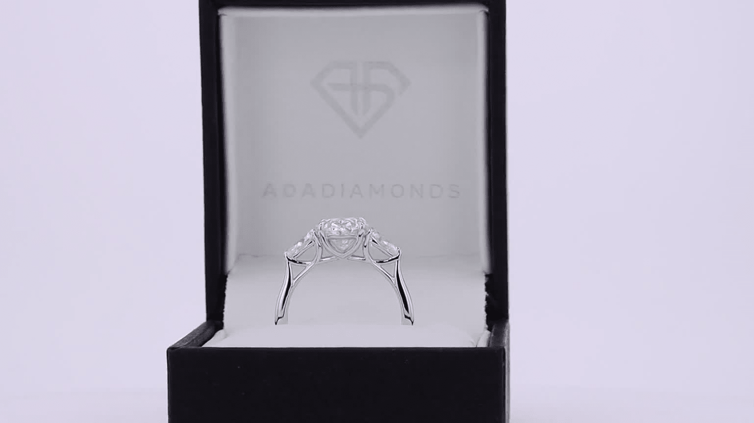 A modern setting, featuring a pair of pear cut lab grown diamond side stones. Available in trellis or basket style.