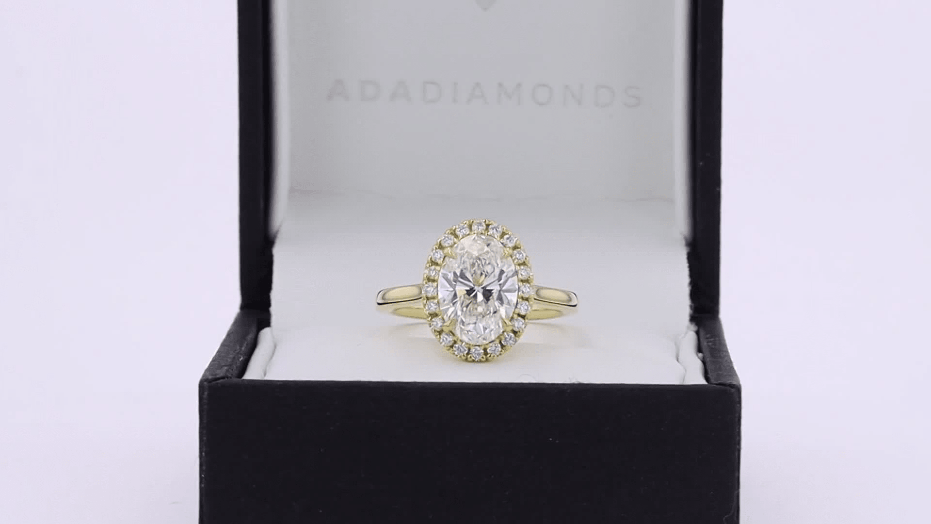 lab created oval diamond in a 14k yellow gold halo solitaire setting Ada Diamonds Design AD-416 in box