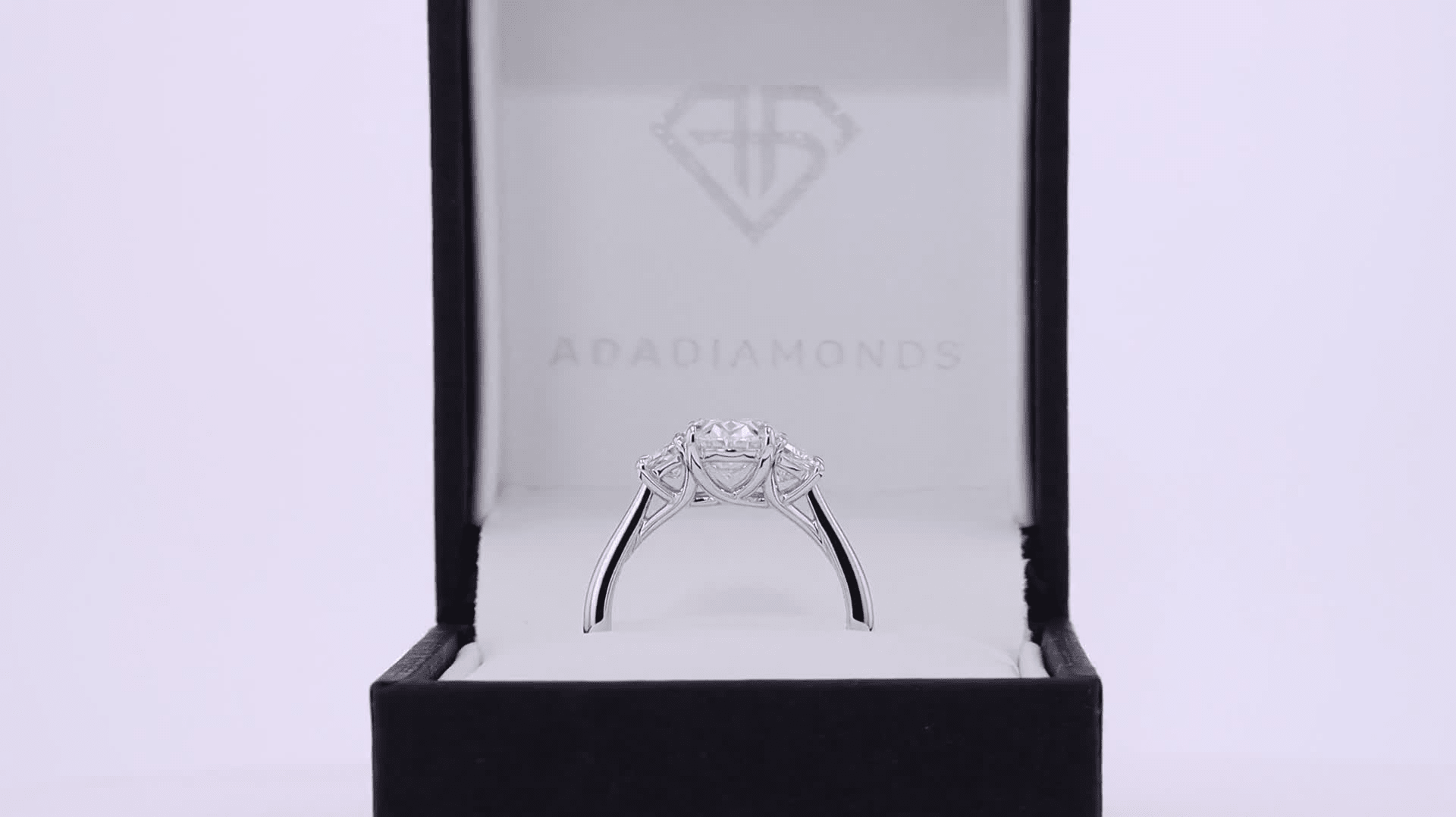 A modern three stone engagement ring setting, featuring a pair of brilliant cut trapezoid lab grown diamond side stones in a basket or trellis style.