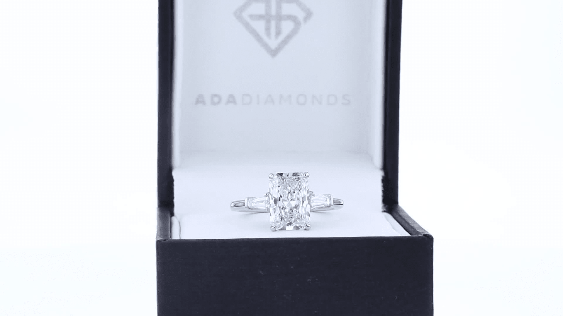 platinum 3 carat radiant cut lab diamond engagement ring with baguette side stones ada diamonds design ad485