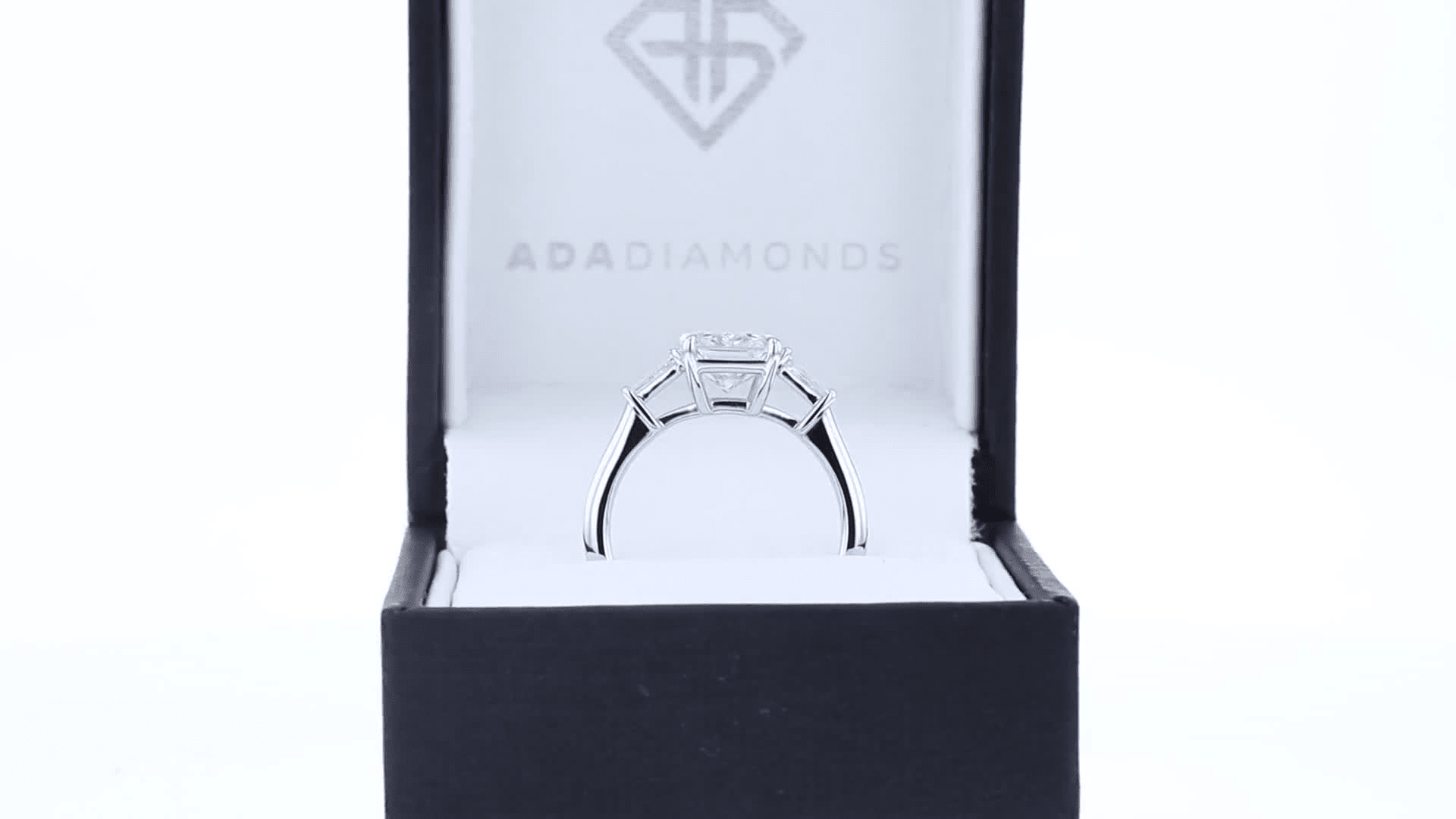 platinum 3 ct radiant cut and baguette three stone lab diamond engagement ring ada diamonds design 485 on model