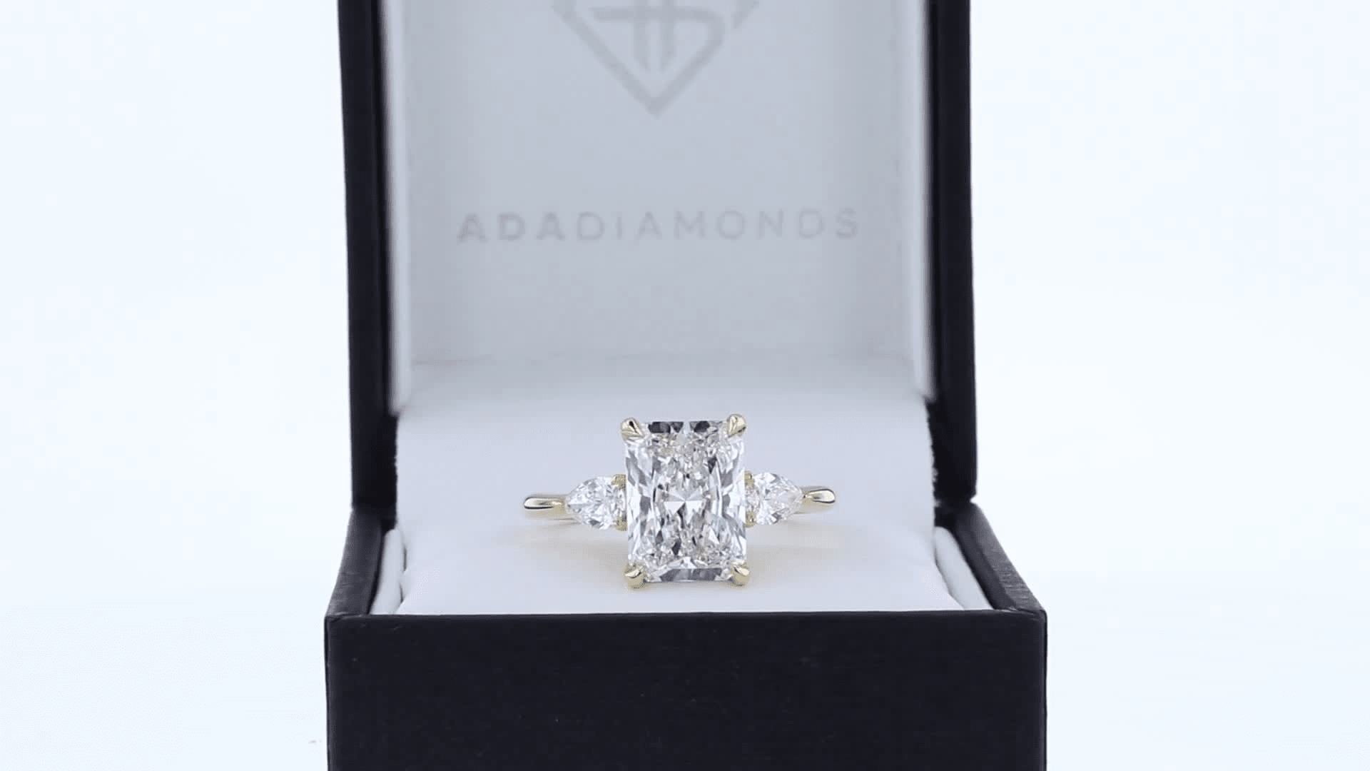 hand-selected radiant lab diamond and pear side stones in a classic 14k white gold ring setting