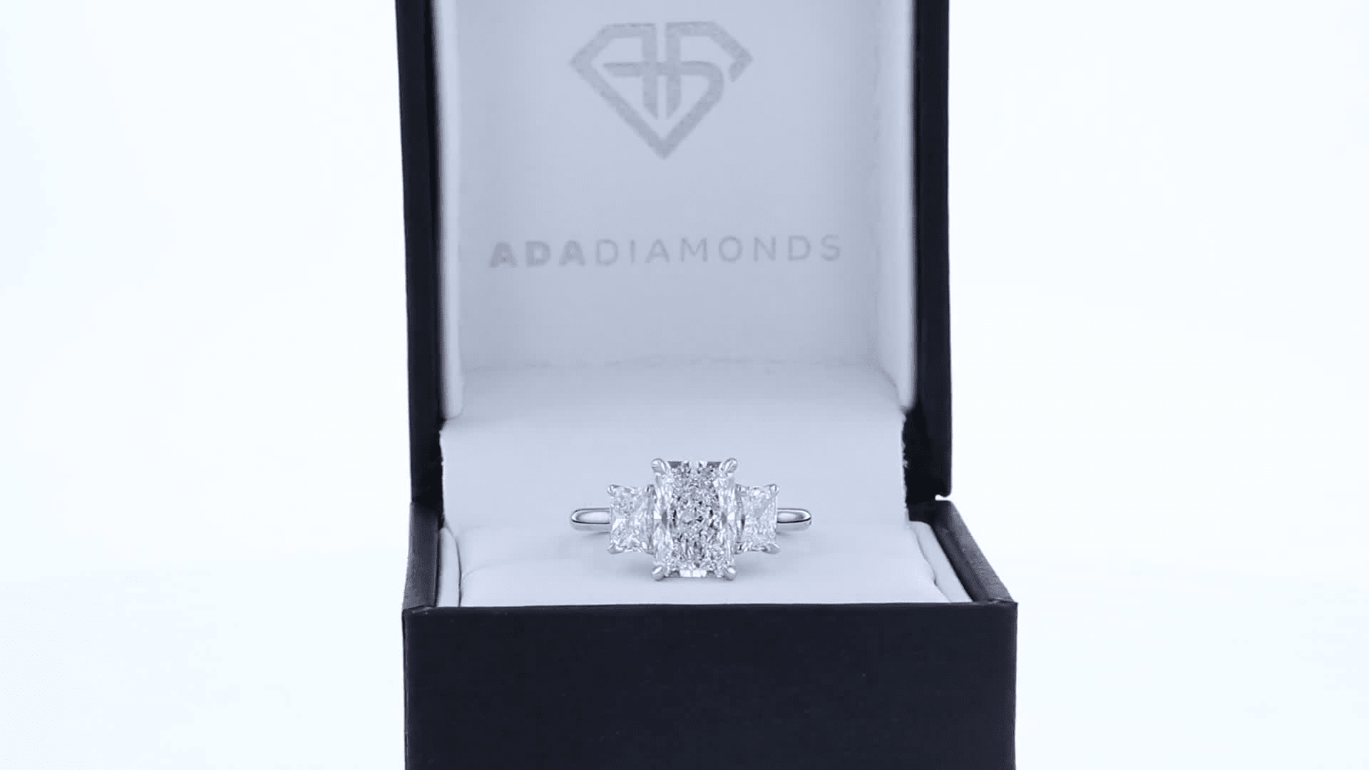 platinum 3.5 carat radiant cut three stone engagement ring with lab created diamonds ada diamonds design ad 484 on model