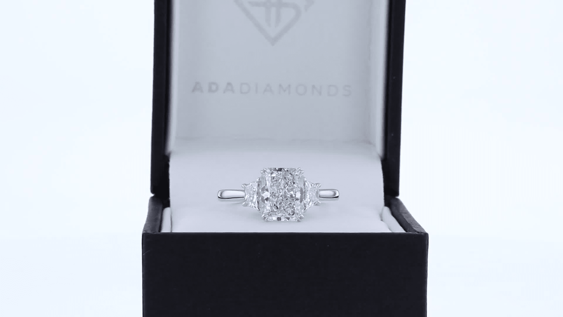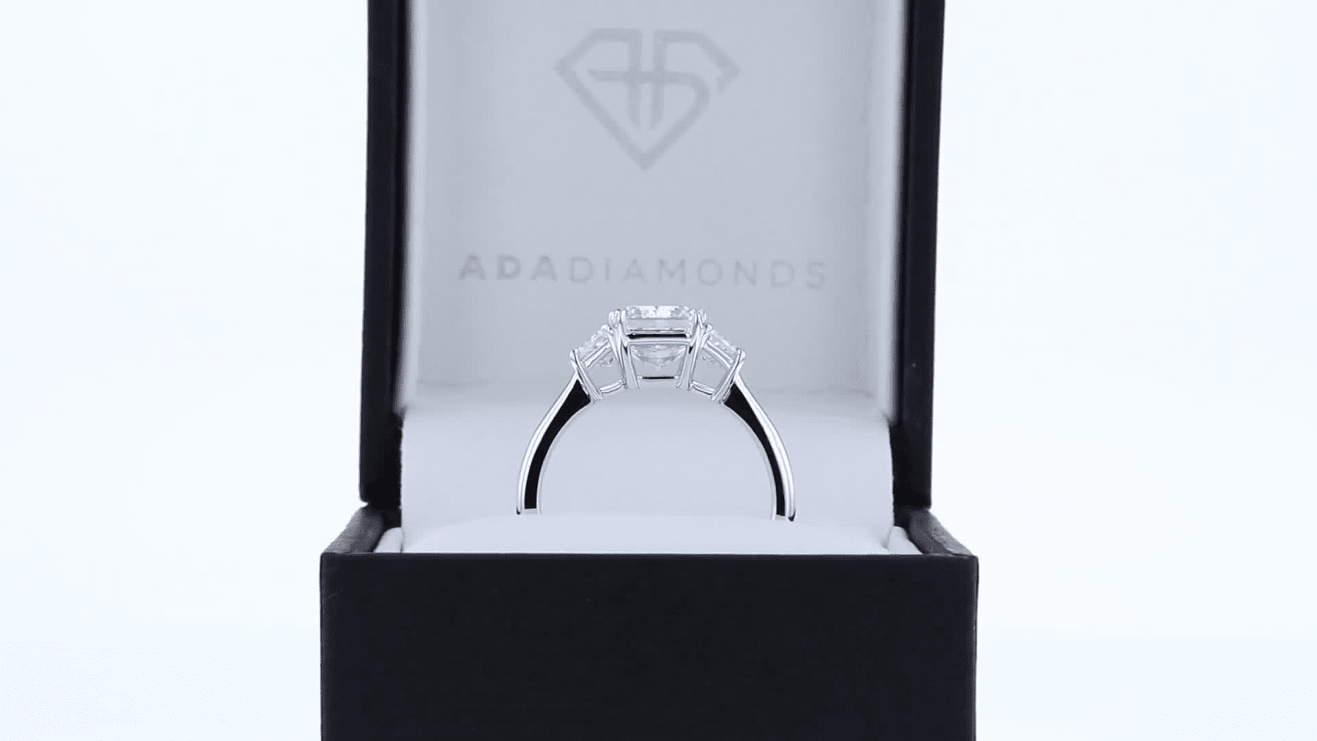 A modern three stone engagement ring setting, featuring a pair of brilliant cut trapezoid lab grown diamond side stones in a basket or trellis style.